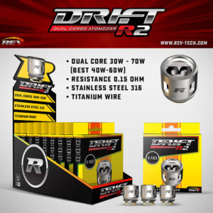 The REV Drift Replacement Coil is designed for Drift Tank. It has 4 style cores – R1 0.6ohm (Single Core), R2 0.15ohm (Dual Cores), and R4 0.15ohm (Quad Cores), which bring various clouds, nice flavors, and great vaping experiences. 3pcs each pack. Get them as spare parts.