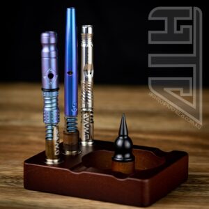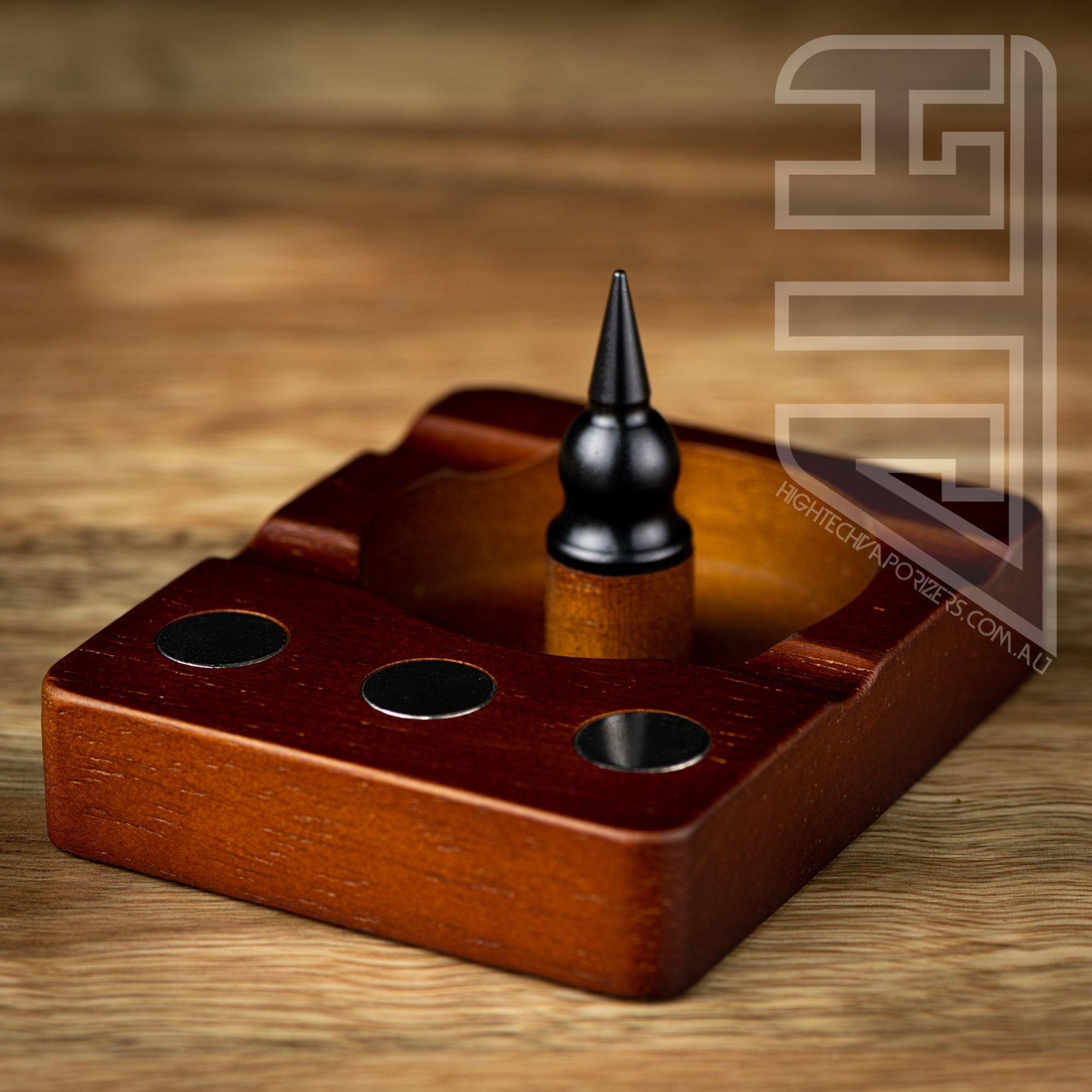 Built for use for Dynavap and other like devices. This wooden debowler stand has 3 magnets imbedded into the wood for holding your dynavaps and for removing dynavap caps. In the centre of the spent herb dish is a solid steel spike which helps dig out spent herb.